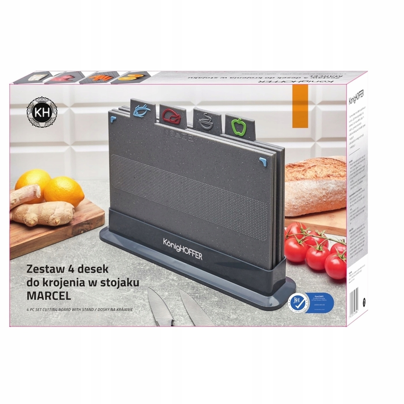 Набір із чотирьох обробних дощок з підставкою Konighoffer Marcel, розміром 29 x 22,5 x 0,6 см, виготовлений із пластику. Його дизайн натхненний гранітом. Він елегантно виглядає на кухонній стільниці, а також ідеально підходить для нарізання різноманітних інгредієнтів. Кожна дошка має різне призначення. Їхня поверхня спеціально розроблена для нарізання хліба, м'яса, овочів, фруктів та ніжної риби. Вони не затуплюють ножі та не вбирають запахи. Їх також легко мити, навіть у посудомийній машині. Силіконові вставки різних кольорів запобігають ковзанню на стільниці під час нарізання. Набір Konighoffer Marcel включає чотири двосторонні дошки, виготовлені без BPA.